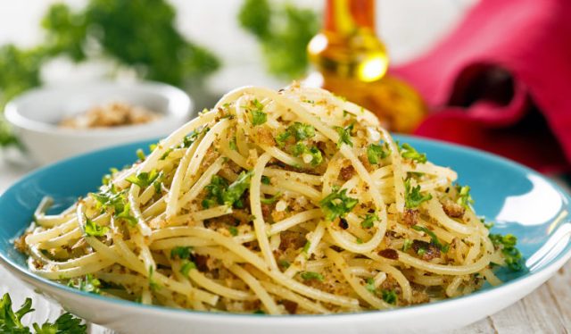 Dissalate le acciughe e sfilettatele, spezzate a mano i grissini. Mettete un poco di olio in una padella e i grissini, fateli tostare e metteteli da parte (serviranno per il condimento finale). Prendete un’altra padella e metteteci il burro con un filo d’olio e aggiungete i filetti di acciughe, fate sciogliere il tutto a fuoco medio. Nel frattempo cuocete i vostri spaghetti in abbondante acqua ma poco salata, e quando la pasta inizia a piegarsi aggiungetela subito in padella per terminare la cottura con il sugo e aiutatela a cuocere aggiungendo l’acqua di cottura, saltate e mantecate alla fine. Aggiungete le foglie di basilico, spezzettate a mano e una volta che avete messo nei piatti la pasta, condite con i grissini tostati precedentemente.