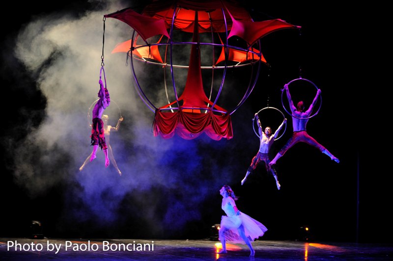 Amori sospesi tra cielo e terra e danze appese nel vuoto trasporteranno lo spettatore in un mondo di fiabe e metamorfosi attraverso gli spazi magici e infiniti della fantasia umana.