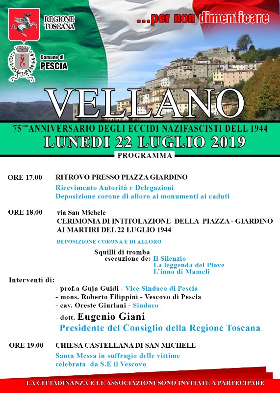 Con una semplice seppur significativa cerimonia promossa dal Comune di Pescia, si aprono a Vellano, lunedì 22 luglio alle ore 17, le cerimonie in programma per ricordare gli eccidi commessi dai nazifascisti nel nostro territorio nel 1944. In quella drammatica giornata, toccò proprio al paese più grande della montagna pesciatina conoscere l'atroce dolore di vedere trucidati paesani inermi e le case fatte saltare con l'esplosivo lasciando una scia di morte e sgomento difficile da dimenticare.