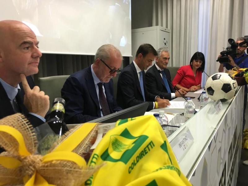 Per la prima volta i contadini italiani scendono in campo negli stadi per promuovere la conoscenza e il consumo del vero cibo Made in Italy con una squadra di oltre 11mila tra fattorie, mercati e agriturismi di Campagna Amica. E’ quanto spiega la Coldiretti in occasione della firma del primo accordo con la Lega Pro per la valorizzazione fra tifosi e calciatori delle migliori produzioni agroalimentari del territorio a chilometri zero. L’intesa firmata a Firenze dal Presidente di Coldiretti Ettore Prandini e dal Presidente di Lega Pro Francesco Ghirelli, alla presenza del Presidente della FIFA Gianni Infantino e del Presidente della FIGC Gabriele Gravina, prevede una collaborazione su un ampio progetto legato alla sana e corretta alimentazione nello sport rivolto ai bambini, ai ragazzi e a tutti gli appassionati di calcio che frequentano gli stadi.