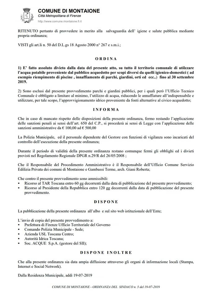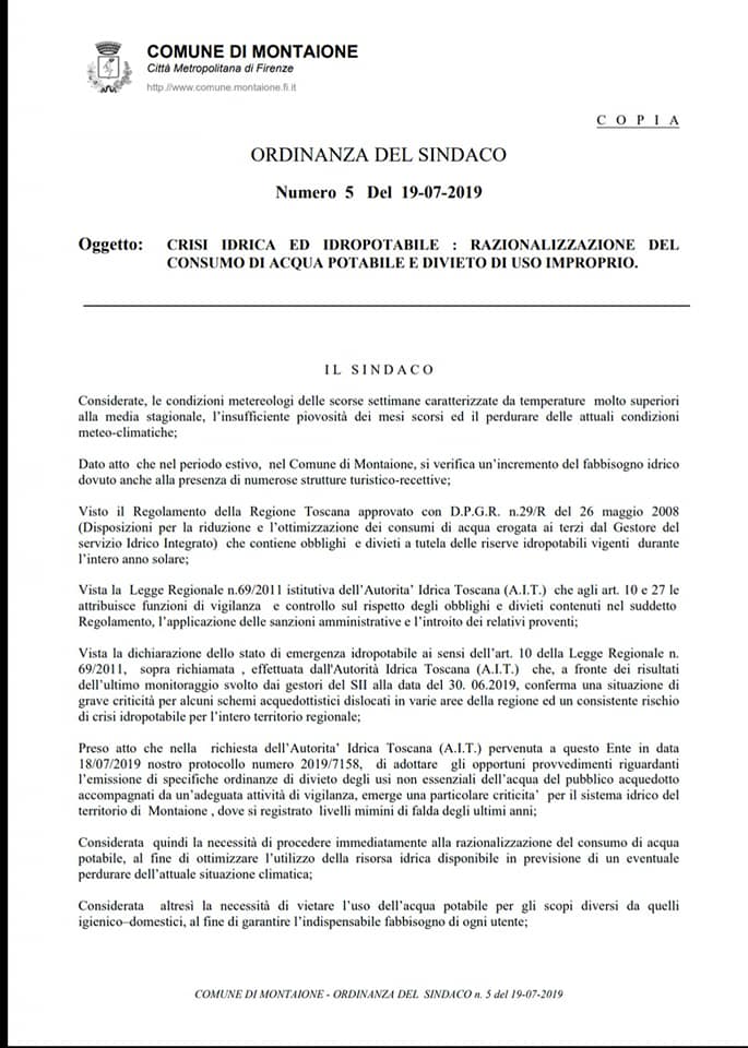 Il primo cittadino ha concluso: "La carenza di risorsa idrica per la nostra area è da tempo sotto monitoraggio da parte dell’Autorità Idrica e sono stati effettuati sondaggi per la realizzazione di nuovi pozzi. Nonostante le difficoltà a reperire nuova risorsa idrica, un paio di pozzi sono in fase di progettazione, mentre uno è stato recentemente realizzato e si attendono le necessarie verifiche prima della messa in funzione. Ecco quindi che oggi ho emanato apposita ordinanza per un uso responsabile, e rispettoso delle norme, della risorsa idrica. Purtroppo da anni Montaione non gode più di autosufficienza idrica, l’acqua distribuita arriva anche da risorse presenti in territori limitrofi".