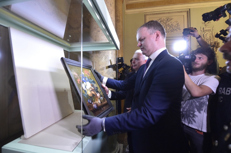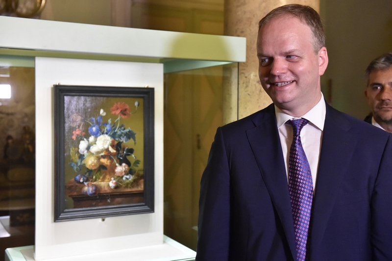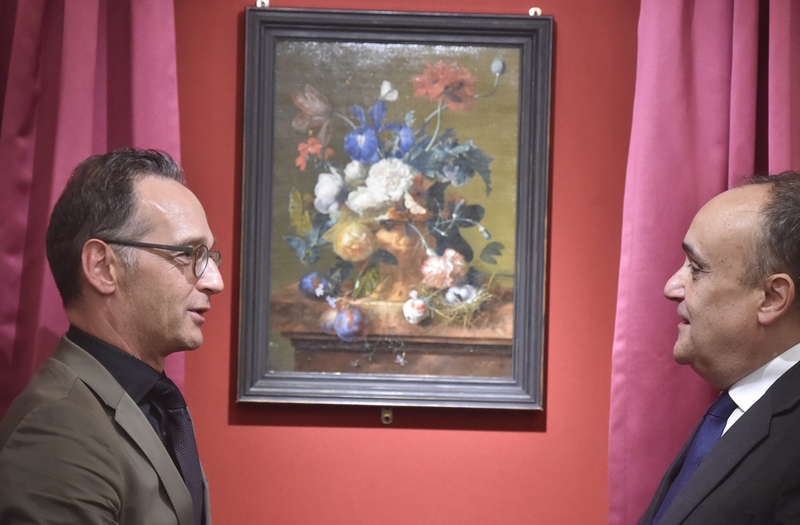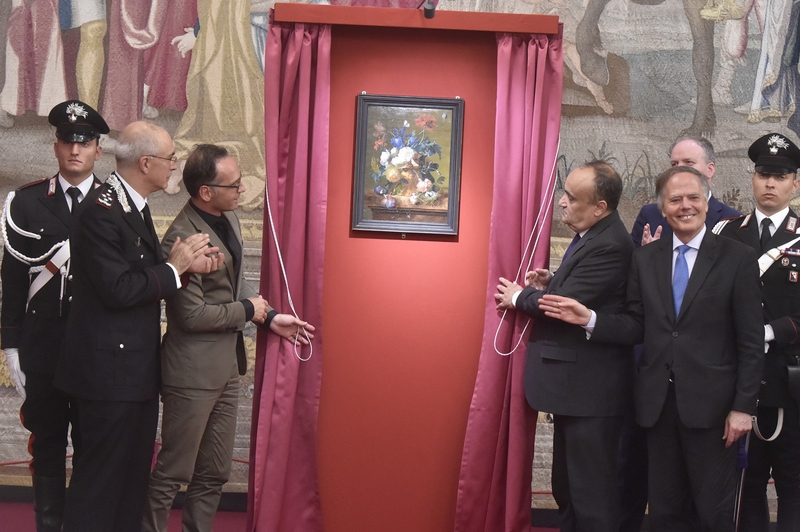 Il Vaso di fiori di Jan van Huysum (olio su tela, 47x35 cm, 1720-1730 circa), dopo un'assenza di 75 anni da Palazzo Pitti, resterà ora esposto nell'ambito di una speciale mostra all'interno di una grande teca nella sala della musica della Galleria Palatina per circa quattro mesi. Dopodiché tornerà nella sua originaria collocazione, nella sala dei Putti, sempre all'interno della Galleria Palatina. La riproduzione fotografica del Vaso, con la scritta 'rubato' appesa al suo posto il primo gennaio di quest'anno, quando il Direttore lanciò il suo appello alla Germania per la restituzione del dipinto trafugato dai nazisti, è stata consegnata questo pomeriggio, dopo la cerimonia, al ministro per gli Affari Esteri tedesco Heiko Maas, che la porterà a Berlino con un volo di Stato. Come aveva promesso il 1 gennaio lo stesso direttore degli Uffizi, in cambio della restituzione dell'originale all'Italia, la Germania avrà a disposizione la copia 'speciale' dell'opera, a suo modo anch'essa unica. "Grazie alla forza della storia dell'arte, oggi tutti insieme rendiamo giustizia alla storia - ha detto il direttore degli Uffizi Eike Schmidt - è con la massima gratitudine che oggi riaccogliamo il Vaso di Fiori di Jan Va Huysum, dopo un'assenza di 75 anni. Oggi è un grande giorno per le gallerie degli Uffizi, per Firenze, per l'Italia, e per l'umanità intera. Mi auguro che questa restituzione, importantissima, sia la prima di un lunga serie di recuperi di opere d'arte da realizzare. Viva Firenze, viva la giustizia, viva l'amicizia tra i popoli! Per il ritorno di oggi - ha aggiunto Schmidt – c’è stato un grande lavoro di squadra, con ben cinque ministeri coinvolti, soprattutto il Mibac, e il ministero degli Esteri. Questo intenso sforzo collettivo ha consentito di compiere un vero gesto di giustizia storica; io sono molto convinto e soddisfatto di ciò abbiamo fatto. Io rifarei tutto, di nuovo, subito".
