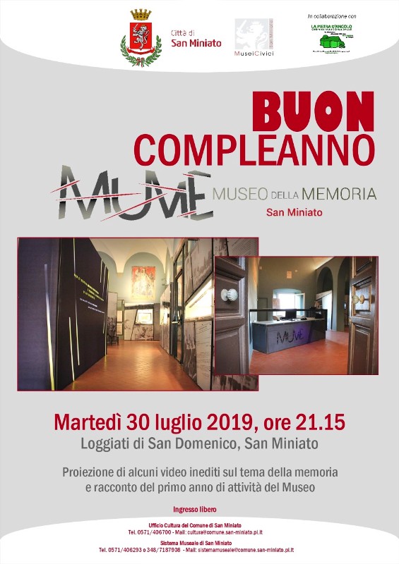 E' già trascorso un anno da quando, il 24 luglio 2018 giorno della Liberazione della città, si sono aperte per la prima volta le porte del MuMe-Museo della Memoria di San Miniato, alla presenza di numerose autorità e tanti cittadini che quel progetto lo hanno visto realizzarsi passo dopo passo. E' un Museo nato dall'esigenza di realizzare uno spazio dedicato alla conservazione dell’insieme di valori e testimonianze della storia più recente della comunità, in particolare per gli avvenimenti della seconda guerra mondiale, i valori dell’antifascismo e della resistenza. Qui si mantiene viva la testimonianza delle persone che hanno vissuto gli orrori della guerra, attraverso un itinerario visuale e documentale degli episodi che hanno interessato direttamente la città di San Miniato.
