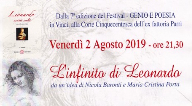 Il Circolo Poeti e Scrittori – Empoli invita venerdì 2 Agosto 2019 alle ore 21,30 alla 7° edizione del Festival – GENIO E POESIA in Vinci, alla Corte Cinquecentesca dell’ex fattoria Parri. Si terrà L’infinito di Leonardo, da un’idea di Nicola Baronti e Maria Cristina Porta. Andrea Giuntini sarà la voce narrante, Tiziana Giuliani si occuperà dei movimenti coreografici, mentre si esibiranno anche i Duo-Mila.