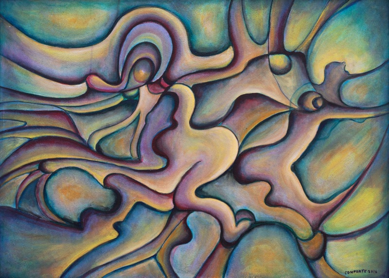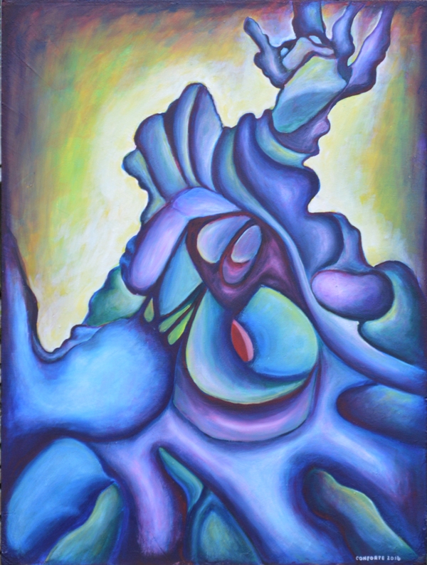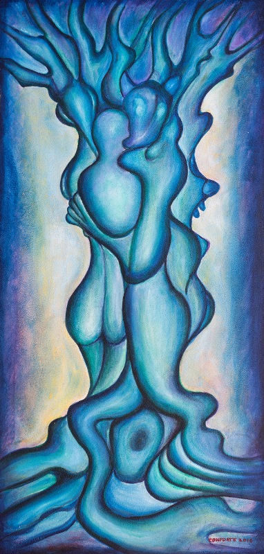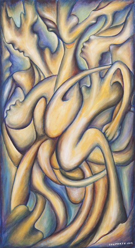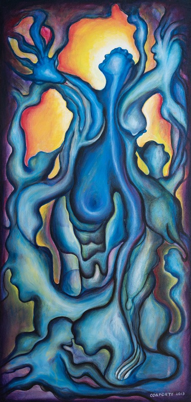 Quasi che la pittura di Conforte risponda ad una sorta di richiamo panteista, dove l’arte ed il pittore assomigliano ai ritmi lenti ed evocativi della vita agreste e della pastorizia. Il canto che si ascolta appunto nei suoi quadri più recenti è di grande delicatezza, si svolge sui toni cromatici dell’azzurro, dei verdi, dei gialli del grano e solo raramente del rosso delle ferite e del dramma. Sono quadri pieni di luce, di energia, di un uomo appagato, di un dio Pan che vive in simbiosi con la natura, che ne conosce grandezza e limiti, eros e thanatos, amore e morte, come nelle storie più belle.