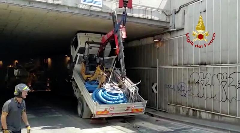Un camion è rimasto incastrato in un sottovia in via Panciatichi a Firenze. Il mezzo, adibito al trasporto di materiale edile, per cause in corso di accertamento si è incastrato con la gru retro-cabina al soffitto all’ingresso del sottopassaggio di via Nello Carrara ed è rimasto con la parte anteriore del mezzo sospeso in aria.