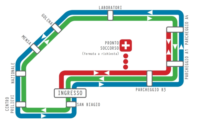 Due linee seguiranno lo stesso percorso, ma in opposta direzione: una in senso orario (la verde), l’altra antiorario (la blu). Ogni fermata avrà quindi due pensiline, ai due lati della strada: pazienti, visitatori e dipendenti potranno scegliere quale utilizzare in funzione della vicinanza alla loro meta.