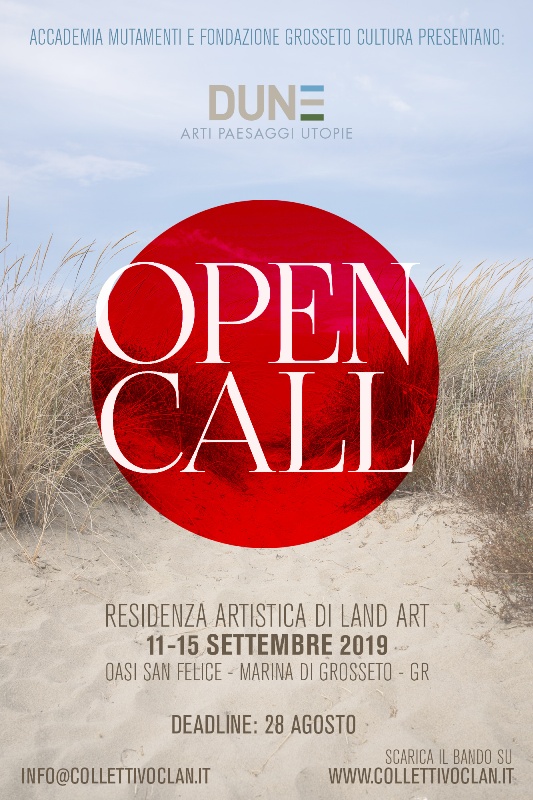 Il progetto “Dune” è la prima fase del più ampio programma “Laboratorio Utopia 2019/2021”, un progetto triennale pensato dalla compagnia teatrale Accademia Mutamenti e da Clarisse Arte di Fondazione Grosseto Cultura che mette a disposizione residenze artistiche di ricerca e creazione interdisciplinare coinvolgendo artisti di varie discipline, scienziati e naturalisti, con l’obiettivo di produrre visioni nuove e trasversali sui temi legati all’ambiente e al territorio, e a nuovi modi di comunicarle. Per tutte le info, il bando e la domanda di adesione, scrivere a info@collettivoclan.it.