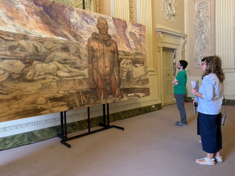 Memoria di una ferita ancora viva nel corpo della città, e nello stesso tempo monito simbolico contro dittature e guerre, questa apertura straordinaria ad ingresso libero è sottolineata dall’allestimento, nell’Anticamera degli Staffieri della Galleria di Arte Moderna di Palazzo Pitti, del colossale cartone preparatorio del Dittatore folle del fiorentino Galileo Chini (2,40x4,53 metri), che resterà esposto per tutto il mese di agosto. L’opera fu realizzata nel 1939, un anno dopo la visita di Adolf Hitler a Firenze, nel periodo in cui il Führer invadeva la Polonia: nella sua allucinata espressività, essa si costituisce come un manifesto lucido e brutale di quella situazione storica, e testimonia l’impegno e il tormento dell’artista nei confronti degli orrori della guerra appena cominciata.