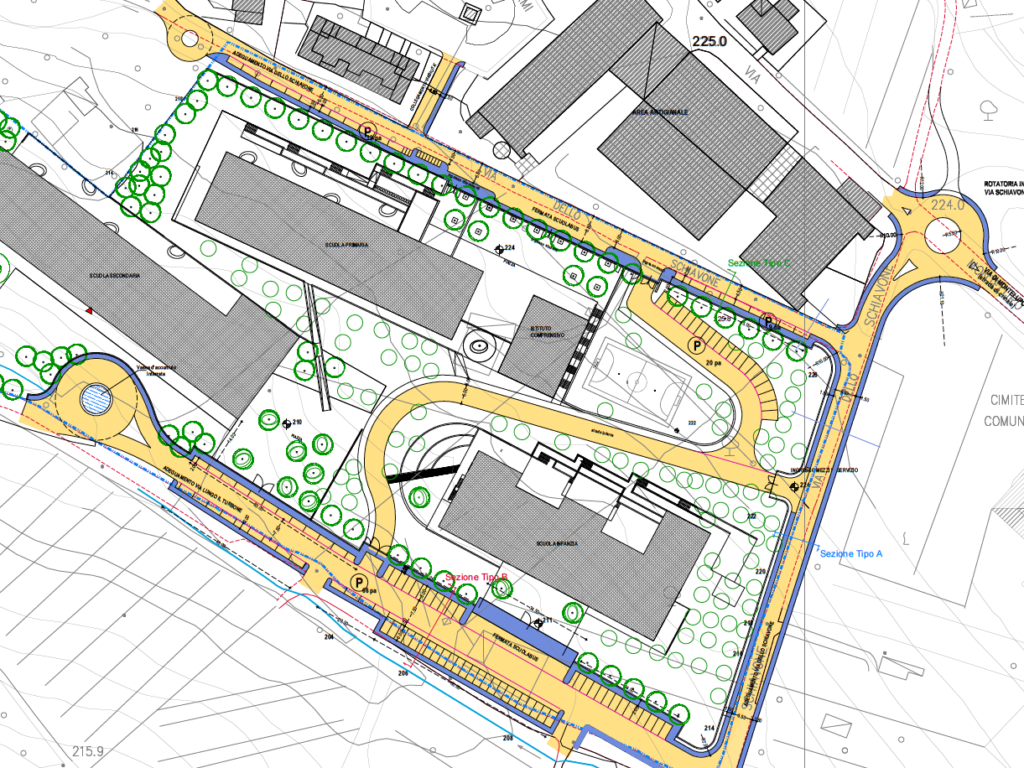 Lungo la viabilità in progetto sono stati previsti i servizi a rete quali fognatura, acquedotto, illuminazione pubblica, connettività, servizi elettrici e metano. Tutta la viabilità dell'area è incentrata per dotare il polo scolastico di accessi indipendenti per Scuola dell'Infanzia e Scuola Primaria e per consentire un accesso pedonale in sicurezza a tutta l'area.