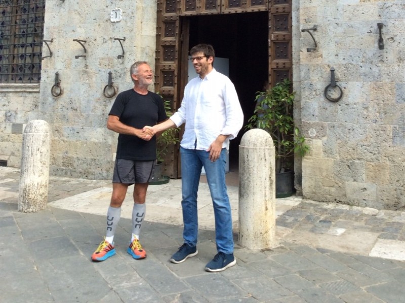 Gianpaolo Fattori, uno dei diciannove tedofori italiani dei XXIII Giochi Olimpici invernali 2018 di Pyeongchang nella Corea del Sud, nonché testimonial della passata edizione della World Francigena Ultramarathon, ha scelto di affrontare un’altra sfida. Ripercorre per intero i 1.700 km della Via Francigena da Canterbury a Roma. Dopo 63 giorni di viaggio, oggi ha fatto tappa nella città del Palio dove, nel pomeriggio, ha incontrato il vicesindaco Andrea Corsi. «Un’opportunità di confronto - afferma Corsi - con chi ha fatto dell’impresa sportiva, il manifesto di quel ‘turismo lento’ che l’amministrazione sta portando avanti con iniziative concrete volte alla valorizzazione del nostro territorio, e a trasformare la Via Francigena in un percorso di eccellenza slow, da vivere a piedi e in bicicletta. Un lavoro di squadra che ha coinvolto Comuni e Associazioni per una conservazione e un miglioramento del reticolo di strade bianche che si potrà toccare con mano proprio in occasione della prossima edizione della camminata sull’antico percorso di Sigerico, il 12 e 13 ottobre».