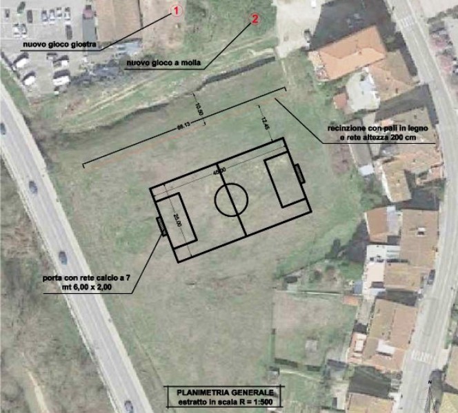 - Recinzione con struttura portante in pali di castagno della lunghezza di 2 metri e recinzione a rete metallica per separare la zona del Borro dall'area del campetto