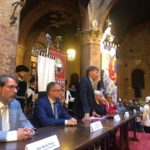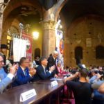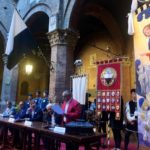 Una sintesi dinamica e lirica che ritroviamo anche nell’originale rappresentazione dell’araldica contradaiola. Gli stemmi, in oro, corrono lungo il drappellone sollevando polvere di stelle.