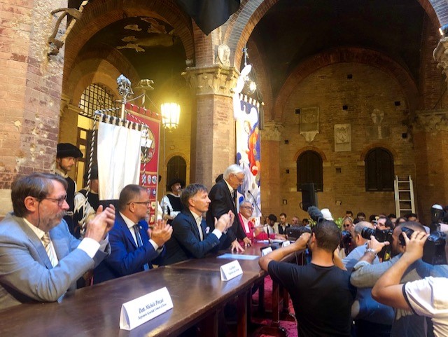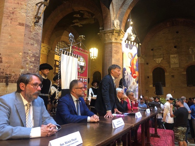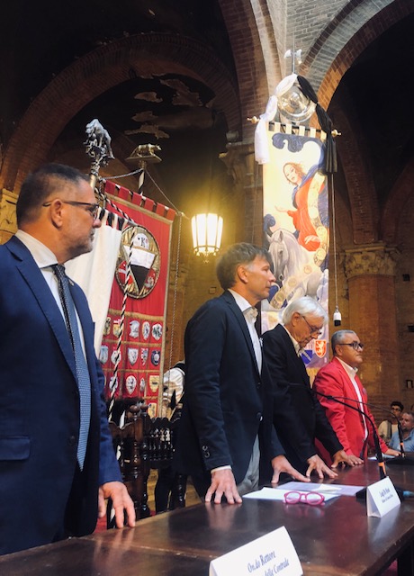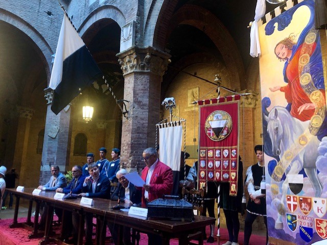 Una sintesi dinamica e lirica che ritroviamo anche nell’originale rappresentazione dell’araldica contradaiola. Gli stemmi, in oro, corrono lungo il drappellone sollevando polvere di stelle.