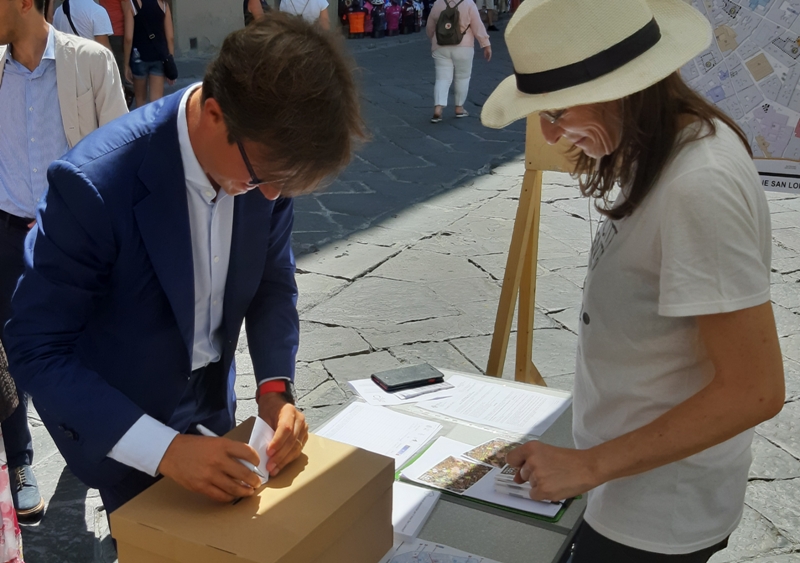 Molti i cittadini, tra cui anche il Sindaco Dario Nardella, che si sono fermati a raccogliere informazioni alla postazione del «Laboratorio San Lorenzo», organizzata dai promotori del processo partecipativo in occasione della festa rionale di oggi, Sabato 10 agosto, proprio in Piazza San Lorenzo.