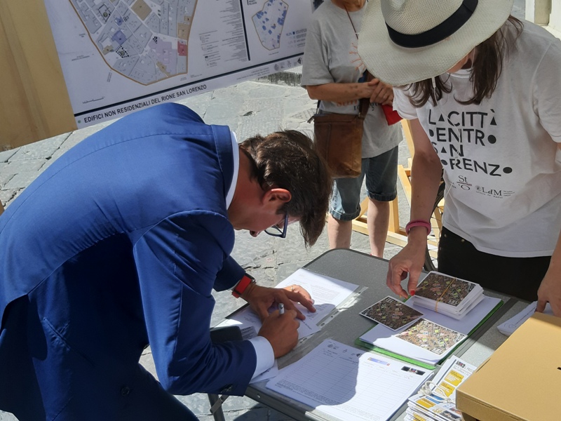 Molti i cittadini, tra cui anche il Sindaco Dario Nardella, che si sono fermati a raccogliere informazioni alla postazione del «Laboratorio San Lorenzo», organizzata dai promotori del processo partecipativo in occasione della festa rionale di oggi, Sabato 10 agosto, proprio in Piazza San Lorenzo.
