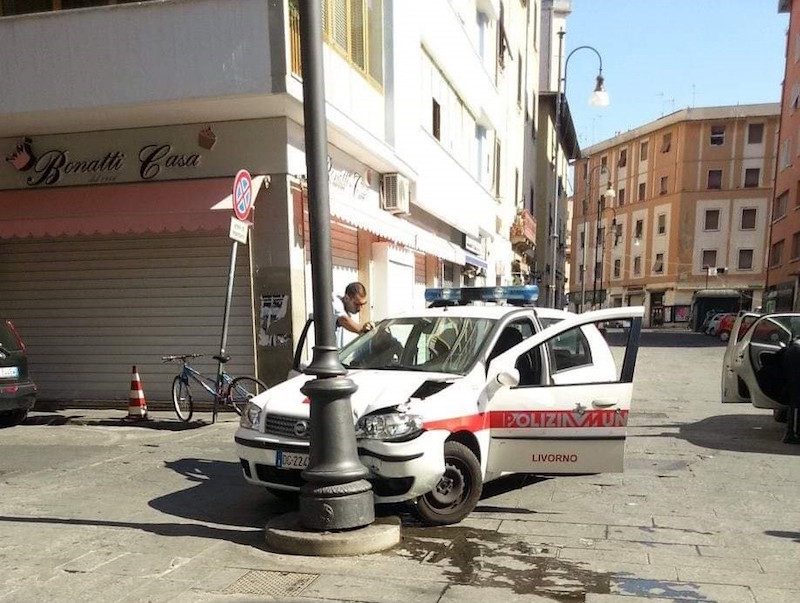 Sta girando sui social una foto del 2013, pubblicata come se fosse recente, che raffigura una macchina della Polizia Municipale di Livorno incidentata contro un lampione nella zona del mercato di piazza Cavallotti.