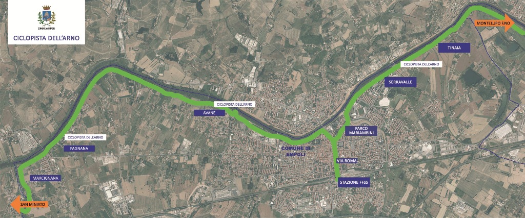 Partiranno lunedì 26 agosto i lavori che porteranno, in neanche un anno di tempo, alla realizzazione della percorso ciclo-pedonale lungo il fiume Arno. Dieci chilometri che interessano il territorio del Comune di Empoli, dalla frazione di Marcignana a Pagnana, da Avane al centro cittadino, fino alla zona di Serravalle e poi a Tinaia, al confine con Montelupo.