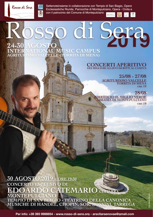 Chiuderà la stagione 2019 del festival, Edoardo Catemario con un concerto esclusivo nel Tempio di San Biagio a Montepulciano (Teatrino della Canonica) venerdì 30 agosto alle ore 19:30. Il maestro proporrà un programma di musiche arrangiate per chitarra sola di G.F. Handel, F. Sol, F. Tarrega, F. Chopin, canzoni napoletane antiche e la celebre Danza di G. Rossini. Una serata unica nel suo genere alla quale seguirà un buffet (a offerta libera) in cui poter degustare i prodotti e le eccellenze culinarie senesi delle aziende Podere Pereto, Caseificio Cugusi, Macelleria Belli, Azienda agricola Saragiolo e i vini del Consorzio del Vino Nobile di Montepulciano.