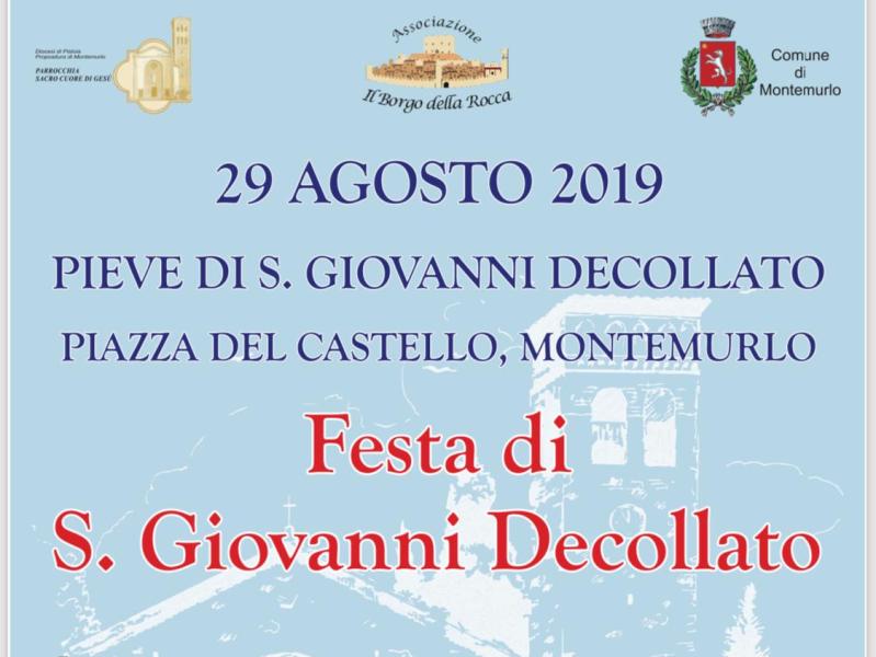 Dopo molti anni di sospensione Montemurlo torna a celebrare la Festa di San Giovanni Decollato.L'appuntamento è per giovedì 29 agosto, quando alle ore 18,00 nell'omonima pieve in piazza Castello alla Rocca di Montemurlo, si svolgerà una messa celebrativa, alla quale seguirà la conferenza “San Giovanni, un nome, una storia”, che intende illustrare i progressi fatti nello studio della storia della Pieve. L'iniziativa è promossa dalla parrocchia del Sacro Cuore di Gesù e dall'associazione Il Borgo della Rocca con il patrocinio del Comune di Montemurlo.