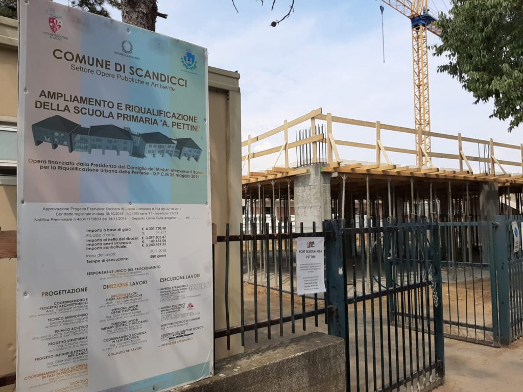 I lavori nelle scuole di Scandicci procedono nei tempi concordati per garantire un rientro in classe senza disagi. Nella mattina di mercoledì 28 agosto 2019 il Sindaco Sandro Fallani e l’assessore alle Opere pubbliche e Vicesindaco Andrea Giorgi hanno effettuato i sopralluoghi nei cantieri della scuola primaria Pettini di via della Pieve, dove sono in corso i lavori per l’ampliamento con 14 nuove aule e per la riqualificazione degli ambienti già esistenti, della scuola media Fermi di via Leoncavallo, dove l’impresa sta effettuando il rifacimento delle facciate e della copertura, e della scuola Dino Campana, plesso che comprende una primaria, una scuola d’infanzia e un centro gioco e che è interessato dai lavori per il miglioramento della sicurezza e dell’antincendio. “Sono in corso tanti investimenti per rendere le nostre scuole sempre migliori – dice il Sindaco Sandro Fallani - portiamo avanti i lavori con quella che è la nostra modalità ormai collaudata, ovvero con la pianificazione dei lavori impattanti nei mesi delle vacanze estive, in accordo con le scuole e con le imprese. Dal sopralluogo di stamani abbiamo verificato come i lavori procedano in tutti e tre i cantieri; per quanto riguarda la Pettini, che con 5 milioni di euro è l’intervento con l’investimento più consistente, stanno procedendo sia i lavori per la riqualificazione del plesso sia quelli per la nuova struttura: data la complessità dell’intervento abbiamo chiesto all’impresa la massima attenzione e il massimo impegno nei lavori, sia all’interno che all’esterno della scuola”.