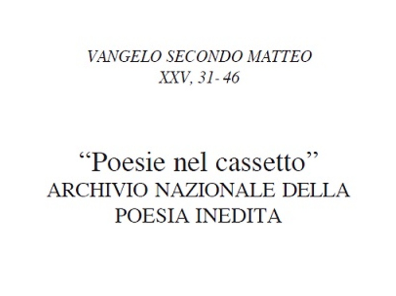 'Poesie nel cassetto' ha scelto quest'anno come tema il capitolo venticinquesimo del Vangelo di Matteo, che presenta due parabole (cinque vergini sagge e cinque stolte e i talenti) e il giudizio universale; giudizio che avviene su come ciascuno si è comportato, in tutta la sua vita, verso gli affamati, gli assetati, gli stranieri, i nudi, gli ammalati, i prigionieri. Sono i poveri. "Sono grato a Vito Taverna e a 'Poesie nel cassetto' - scrive il Presidente di Sant'Egidio Marco Impagliazzo, nella prefazione al volume - per aver voluto condividere con sensibilità e amicizia lo spirito della Comunità di Sant'Egidio attraverso gli strumenti della versificazione e il linguaggio poetico che può esprimere, in modo originale e con i tratti che gli sono propri, la partecipazione a un'umanità risvegliata alle domande degli altri e che recupera quelli che sono considerati “scarti” da una parte della società. Lavoriamo ogni giorno perché nessuno sia escluso e perché si possa vivere in pace, con tutti".