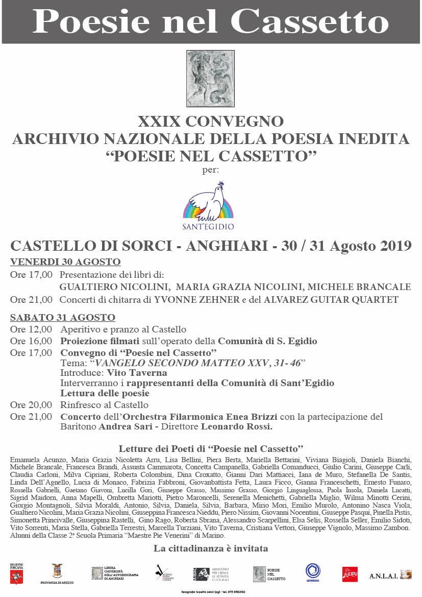 "Poesie nel cassetto" per la Comunità di Sant'Egidio. È ai nastri di partenza ad Anghiari (Arezzo), il 30 e il 31 agosto, la nuova edizione di "Poesie nel cassetto", l'iniziativa fondata e coordinata da Vito Taverna per diffondere attraverso la poesia civile, i valori della solidarietà, della fratellanza e della Pace. Ogni anno viene dedicato un convegno di poesia ad una organizzazione nazionale o internazionale che si occupi di problemi sociali del nostro tempo. Per l'occasione viene redato un libro di poesie a tema, a cui partecipano affermati autori di poesia, le cui copie vengono donate al soggetto prescelto, quest'anno la Comunità di Sant'Egidio, per la raccolta di fondi.