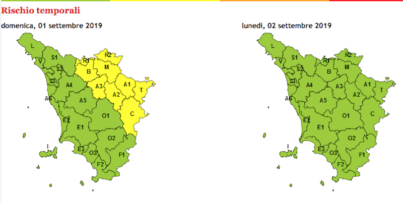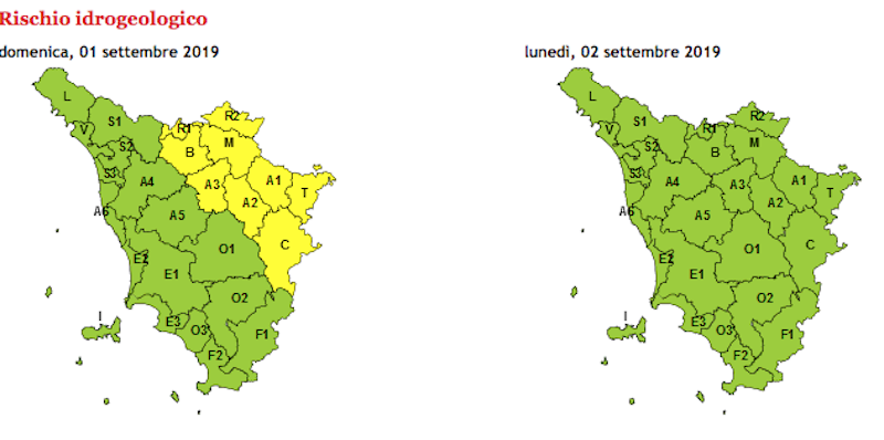 La sala operativa della protezione civile regionale ha emesso un nuovo codice giallo, con validità dalle 14 alle 21 di oggi, domenica 1 settembre, per temporali sparsi nelle zone interne delle province di Arezzo, Firenze, Pistoia, Prato e Siena.