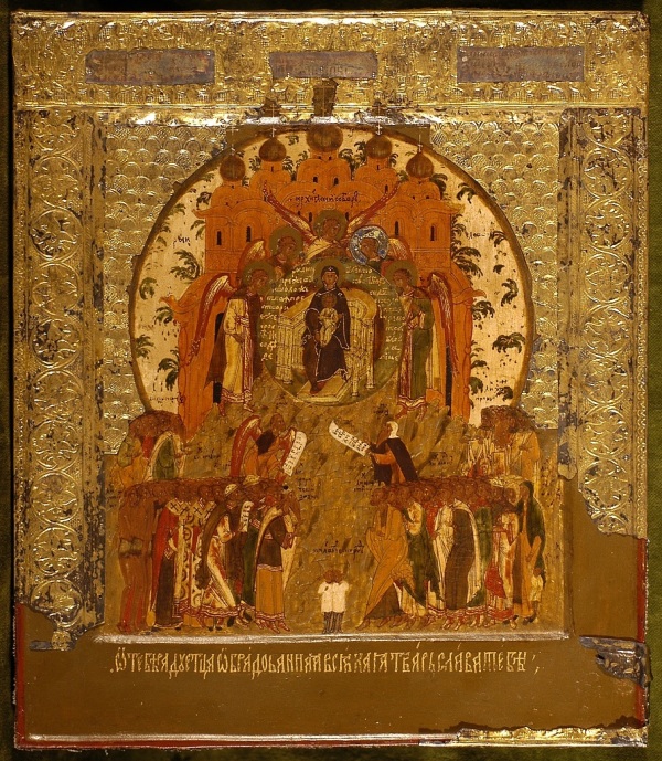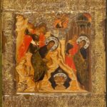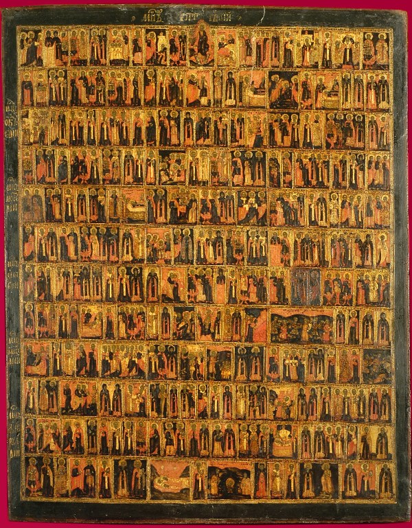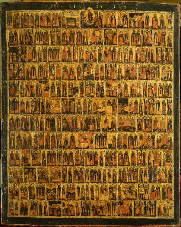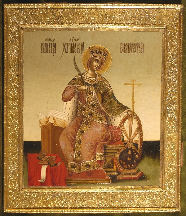 LE OPERE PIÙ SIGNIFICATIVE: Sono da segnalare i due pannelli che compongono il Menologio, ossia il calendario delle festività religiose ortodosse divise per semestri, da settembre a febbraio e da marzo a gennaio: ogni icona si compone di venti file orizzontali con scene sacre e e figure di santi, ciascuna identificata da un’iscrizione. Essi sono sempre rimasti agli Uffizi, per la loro evidente importanza, come l’icona con Santa Caterina d’Alessandria, databile al 1693-1694 grazie al punzone nella oklad di argento dorato (il rivestimento metallico che copre alcune parti delle icone). La principessa martire è raffigurata con attributi molto simili a quelli dell’arte occidentale: la palma e la ruota del martirio, i libri e la sfera armillare che alludono alla sua vasta conoscenza. L’opera è attribuita all’atelier del Palazzo dell’Armeria, la bottega che lavorava alla corte dello zar nel palazzo del Cremlino a Mosca, ed è affinite allo stile di Kirili Ulanov, uno dei più noti maestri dell’atelier moscovita fra XVII e XVIII secolo.