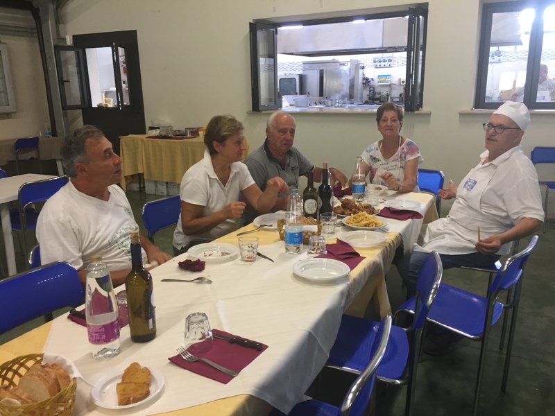 "Pranzo strepitoso con pane fritto, tagliatelle al cunigliolo divine, cunigliolo fritto eccezionale e patatine, il tutto cucinato stupendamente dai volontari del circolo. Davvero un gran pranzo che tutti gli anziani hanno gradito moltissimo! Dopo le migliaia di visitatori della Sagra , così anche gli anziani hanno avuto il loro momento per gustare queste delizie.