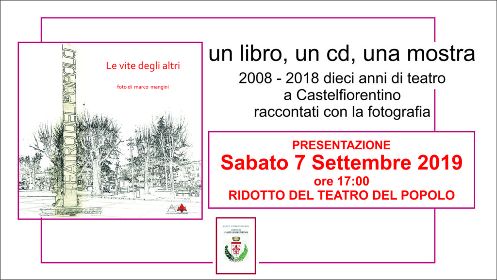 Dieci anni di attività teatrale a Castelfiorentino raccontati attraverso la fotografia (2008-2018). E’ il tema del libro “Le vite degli altri”, foto di Marco Mangini del Gruppo Fotografico “Giglio Rosso”, che sarà presentato sabato 7 settembre 2019 (ore 17.00) al Ridotto del Teatro del Popolo. Il volume, che si può acquistare anche in formato digitale CD (con slide show e musica di accompagnamento) propone una selezione di immagini riprese durante gli spettacoli teatrali delle compagnie presenti a Castelfiorentino negli ultimi dieci anni: la Compagnia Teatro C’Art, la Compagnia Teatrale Passi di Luce, TeatroCastello, l’Associazione Teatrale Culturale GAT di Castelnuovo d’Elsa.