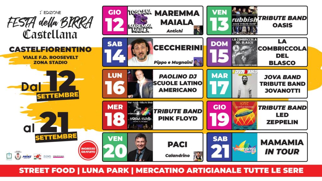 “Una Festa e allo stesso tempo un Festival – sottolinea il sindaco Alessio Falorni – per il numero e la qualità degli spettacoli che ogni sera animeranno l’area del Parco Urbano che si trova dietro lo Stadio Comunale, una zona adatta per questo tipo di eventi. La Festa della Birra è una novità assoluta per Castelfiorentino, una prima edizione che già promette bene e va ad arricchire ulteriormente il panorama degli eventi previsti per il mese di settembre, quando ancora si registrano significative presenze turistiche nel nostro territorio e in tutto l’Empolese Valdelsa. Per questo ringrazio di cuore Emanuele, Enrico e Luca che attraverso la Proloco hanno profuso un impegno davvero straordinario per rendere sempre più ricca e gioiosa la nostra estate castellana”.