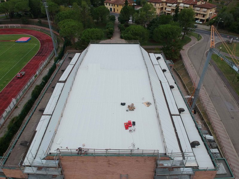 Il tetto del palazzetto, lo ricordiamo, era stato danneggiato lo scorso 26 agosto da un downburst, evento meteo estremo di breve durata, ma fortissima intensità.