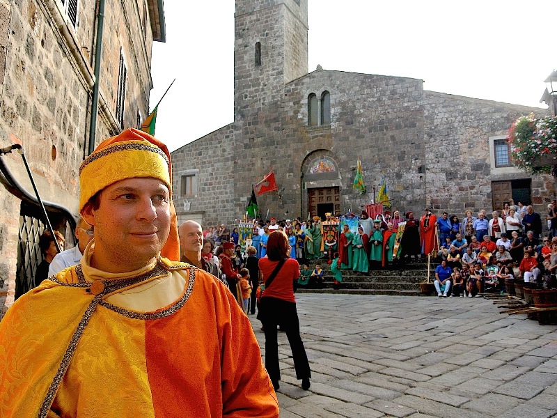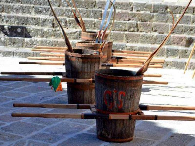 Come si intuisce, due sono le competizioni principali: la gara degli arcieri e la corsa del palio, con la prima che decide l’ordine di partenza, assegnando al vincitore la posizione migliore e, a scalare, alle altre contrade, rispettando il punteggio e la relativa graduatoria. Si determina così una “griglia” di partenza da parte delle due coppie di “barellieri” che si alterneranno durante il percorso. Si corre trasportando un contenitore di legno, il “bigonzo”, un tempo utilizzato per la vendemmia, zavorrato con un peso uguale per tutti, calcolato di volta sulla base del più pesante (intorno ai 20 chili). La competizione, che sarà ripresa per l’intero percorso e proiettata su un grande schermo nei pressi della partenza si svolge lungo le vie del paese, con partenza dalla porta Romana e arrivo in direzione nord nella centrale piazza San Pietro. La manifestazione, relativamente recente, è la celebrazione degli insediamenti che formavano la comunità di Radicofani, ora concentrata in un unico abitato, ai piedi del castello, ma anche di quella che un tempo era l’attività principale del territorio. La viticoltura, negli statuti del 1255 e del 1411, era meticolosamente regolamentata. La produzione era cresciuta durante i secoli sino ad arrivare a duemila some di vino, equivalenti a tremila ettolitri. La zona più vocata per questa produzione era una valle dove, dal XVII secolo, fu costruito il piccolo santuario della Madonna delle vigne, la cui festa si celebra ogni 8 di settembre. Ricollegandosi proprio a questa festa nell’anno 2006 fu riproposta la corsa del Palio relativi ai quattro borghi che esistevano fin dal Medioevo. Il “Palio del bigonzo” si presenta, anche sotto l’aspetto artistico, in grande stile: Iustina Barbulescu ha dipinto il drappellone, che andrà alla Contrada vincitrice, mentre le Ceramiche il Volo di Sarteano hanno realizzato il simbolico piatto dipinto e la pergamena destinati agli arcieri più bravi. Per inciso, Radicofani vanta una società sportiva che primeggia ai massimi livelli di una particolare disciplina, quella di tiro con l’arco da caccia, che fa capo a una federazione del Coni. Sarà una sfida tra molti protagonisti ai recenti campionati italiani, nelle varie categorie, da no perdere Intanto sono stati rinnovati i vertici dell’organizzazione della festa. Al Magistrato delle contrade, all’unanimità, è stato eletto nuovo rettore Alfredo Rossi, già membro onorario insieme a Renato Magi e a Giovanni Fatini, scomparso di recente, tra gli ideatori del Palio radicofanese: a lui è dedicato il torneo degli arcieri. Anche le Contrade, che nel nome ricordano i vari borghi di Radicofani, hanno rinnovato i loro vertici.