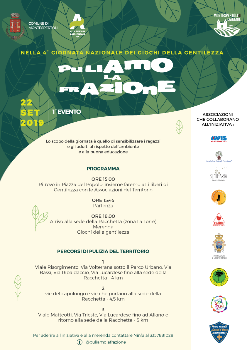 In occasione della 4° Giornata dei Giochi della Gentilezza è stato indetto l'evento "Puliamo la Frazione" dall'Amministrazione Comunale, insieme a diverse Associazioni del territorio, in Piazza del Popolo alle ore 15.00