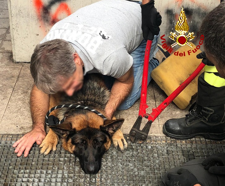 Un cane di razza pastore tedesco è stato liberato dai vigili del fuoco di Montevarchi dopo essere rimasto incastrato con le zampe anteriori in una grata di via Meuccio Ruini. È avvenuto questa mattina, domenica 15 settembre. L'animale è stato in poco tempo rimesso in condizioni di poter tornare con serenità tra le braccia del suo padrone.