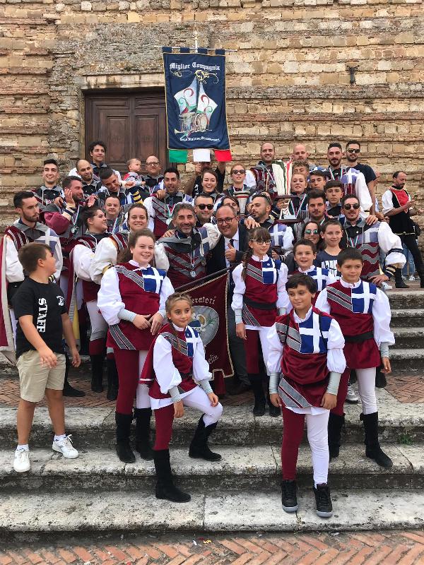 Entusiasta della performance del suo gruppo si dichiara Federico Fanelli, presidente della compagnia di Amelia. “Come tutti gli anni l’impegno è tanto – racconta – ma quest’anno qualcosa di più c’è stato: il lavoro quotidiano dei ragazzi più giovani, e si è visto, nonché una sinergia fortissima tra Andrea Pimpolari e Luigi Bordo che ci ha dato una carica pazzesca. Festeggiamo questi nostri 25 anni di attività della compagnia come meglio non si poteva, specie considerando che quest’anno mi sono rimesso in gioco personalmente in qualità di presidente. Sono veramente contento e orgoglioso del lavoro svolto dai ragazzi, a cominciare da Pimpolari, Bordo, Fabio Barcherini e Alessandro Quadraccia che formavano la piccola squadra, ma veramente il mio bravo va a tutti, compresi i musici e i loro responsabili Stefano Pernazza e Antonio Bussetti, e per gli sbandieratori Mauro Barcherini. Il gruppo non so a chi la dedicherà, ma io sicuramente dedico la vittoria a mia mia moglie”.