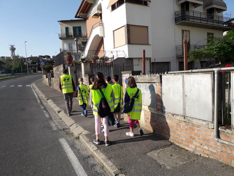 Due/tre volontari accompagnatori della Confraternita di Misericordia ad aprire e chiudere la fila dei bambini, un capolinea, varie “fermate”- proprio come un pulmino – dove i genitori accompagnano i loro figli muniti di pettorina fosforescente che li rende immediatamente visibili e riconoscibili. E da lì a piedi verso la scuola primaria N. Machiavelli.
