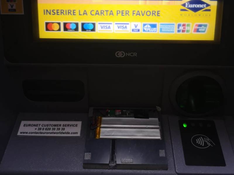 Questi hanno individuato un meccanismo in plastica incollato alla fessura dell’ingresso delle carte magnetiche dello sportello ATM e una piastra in metallo con fissate delle batterie collegate con fili ad un altro dispositivo di archiviazione dati (con scheda micro SD da 32 Giga), con annessa una microcamera.