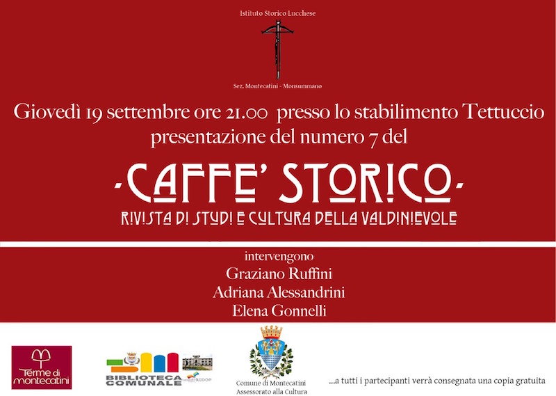 Giovedì 19 settembre alle ore 21 presso lo Stabilimento Tettuccio di Montecatini Terme verrà presentato il nuovo numero di Caffè Storico - Rivista di studi e cultura della Valdinievole a cura della sezione territoriale Montecatini-Monsummano dell’Istituto Storico Lucchese.