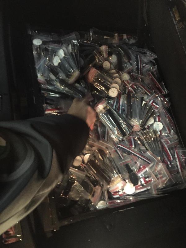 - sequestrati n. 12.000 pezzi fra orologi ed etichette contraffatte e n. 2 autovetture destinate al trasporto;