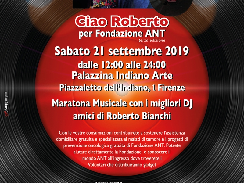 Sabato 21 settembre, alla Palazzina Indiano Arte, in Piazzaletto dell’Indiano 1 a Firenze, in fondo al Parco delle Cascine, si ripeterà per il terzo anno la maratona di musica e solidarietà in ricordo di Roberto Bianchi, proprietario di Disco Mastelloni di Firenze, dedicata a Fondazione ANT.