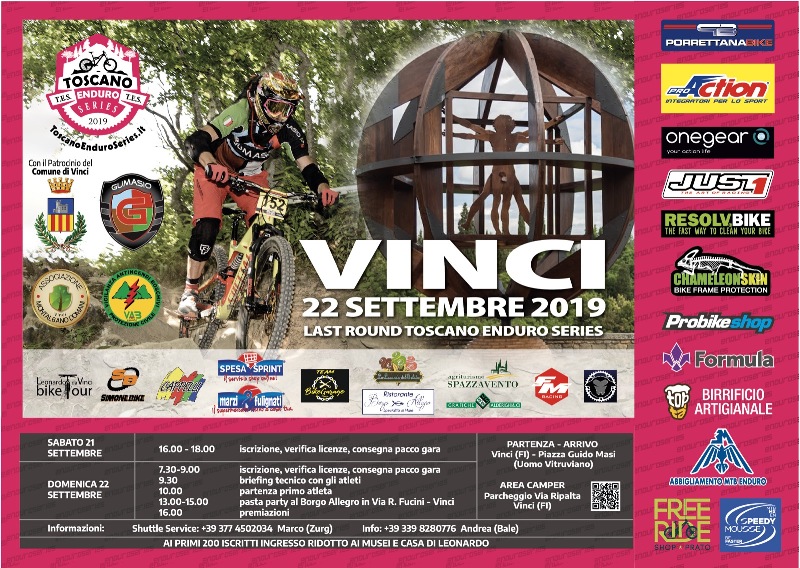 Un omaggio a Leonardo in bici, dopo il passaggio del Giro d'Italia. Parliamo della Toscano Enduro Series che vedrà il 'last round' partire e arrivare domenica 22 settembre proprio dalla città del Genio, da piazza Guido Masi dove ha sede l'opera d'arte raffigurante l'Uomo Vitruviano. In mezzo un percorso tra le campagne natie di Leonardo, in sella alla propria mountain bike, toccando borghi come Vitolini, Faltognano e molti altri luoghi pregevoli.