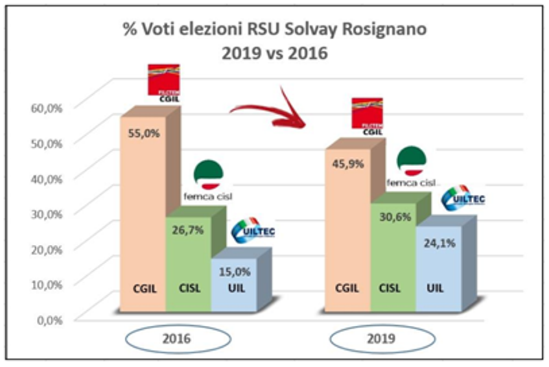 Dal 9 al 13 settembre si sono svolte le elezioni delle RSU dello stabilimento Solvay di Rosignano e cantieri. Grande la soddisfazione della Femca Cisl che per la seconda volta consecutiva, dopo le elezioni del 2016, raggiunge il miglior risultato di sempre nella storia delle elezioni della rappresentanza sindacali unitarie (RSU) di Rosignano.