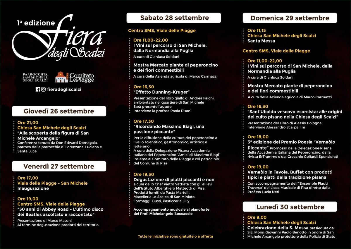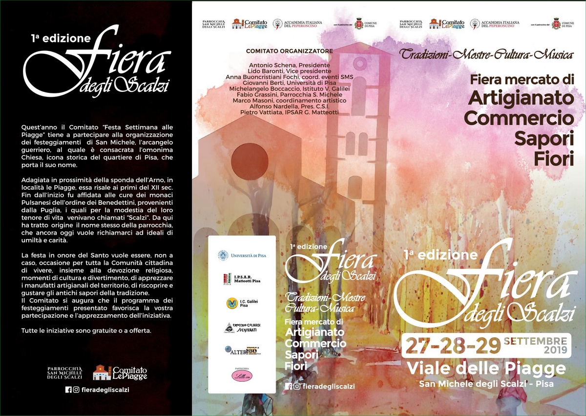 Tutte le iniziative, che si svolgono con il patrocinio del Comune di Pisa, sono gratuite o ad offerta. Giovedì 26 alle 21 nella chiesa di San Michele degli Scalzi si terrà un’anteprima della Fiera.