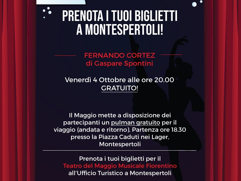 Grande affluenza sabato 21 settembre al Teatro del Maggio Fiorentino per il primo spettacolo proposto ai cittadini della città metropolitana di Firenze. Il prossimo appuntamento è fissato per il 25 Settembre con "Pagliacci/Noi, due, quattro". Anche in questo caso il costo del biglietto è di 15 euro. Il biglietto deve essere obbligatoriamente prenotato all'Ufficio Turistico di Montespertoli e deve essere ritirato direttamente alla biglietteria del Teatro.