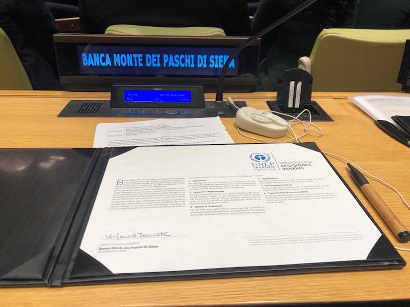 Banca Monte dei Paschi di Siena ha aderito ufficialmente ai Principles for Responsible Banking della Finanacial Initiative dell’UNEP (United Nation Environment Program) diventando una delle 130 banche al mondo “prime firmatarie”. Il programma, sviluppato attraverso una partnership innovativa tra le banche di tutto il mondo e l’Organizzazione delle Nazioni Unite, ha come scopo quello di promuovere interventi per favorire lo sviluppo di un settore bancario sostenibile allineandolo agli obiettivi dell’agenda 2030 delle Nazioni Unite e a quelli dell'accordo di Parigi sul clima del 2015.
