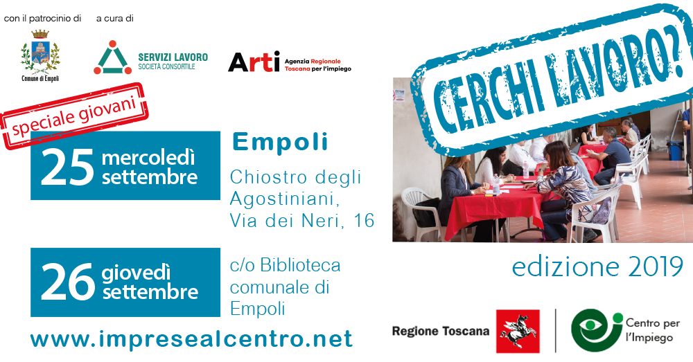 Imprese al Centro, ci siamo. Al Chiostro degli Agostiniani di Empoli domani, mercoledì 25, e giovedì 26 settembre 2019, dalla 9 alle 14, si svolgeranno le due mattine dedicate alle opportunità d’incontro con le aziende del territorio e con i servizi per l’impiego. Un’occasione per chi cerca lavoro o è a ‘caccia’ di nuove offerte.