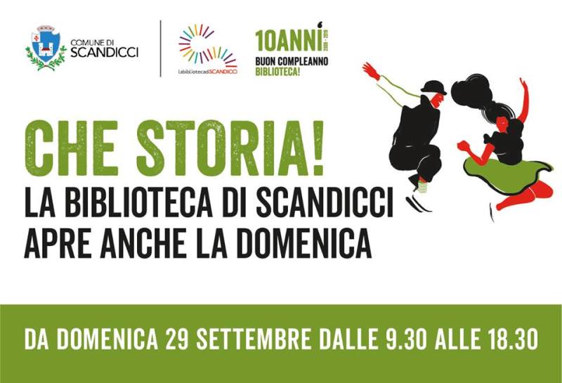 La Biblioteca di Scandicci dal 29 settembre 2019 apre anche la domenica, in orario 9,30-18,30, garantendo così un servizio di apertura completa sette giorni su sette. La struttura del Comune di Scandicci con sede in via Roma 38/a è la seconda Biblioteca a effettuare il servizio di domenica in tutta la città metropolitana di Firenze, affiancandosi alla Biblioteca di Palagio di Parte Guelfa. La novità, presentata dal Sindaco di Scandicci Sandro Fallani e dalla Vice Presidente della Regione Toscana Monica Barni, ha come periodo iniziale quello dalla fine di settembre a tutto dicembre 2019 (resterà chiusa domenica 8 dicembre), dopodiché il servizio domenicale diventerà permanente. L’apertura sette giorni su sette della Biblioteca di Scandicci è la misura strutturale decisa dall’Amministrazione Comunale per la campagna “Scandicci Legge”, di cui fanno parte tanti progetti e attività organizzati in città dal Comune nell'ambito del Patto della Lettura della Regione Toscana. Le attività di “Scandicci legge”, a cui partecipano migliaia di cittadini, sono: Il libro della vita, Libernauta (per lettori dai 14 ai 19 anni), Nati per leggere (0-6 anni), il Circolo di Lettura, Il porto delle storie (11-15 anni), l’offerta didattica della Biblioteca alle scuole (0-14 anni), la rassegna Un libro un film.