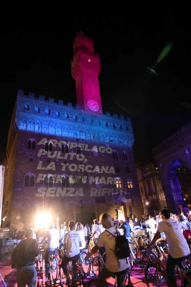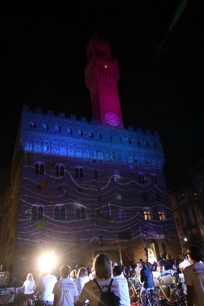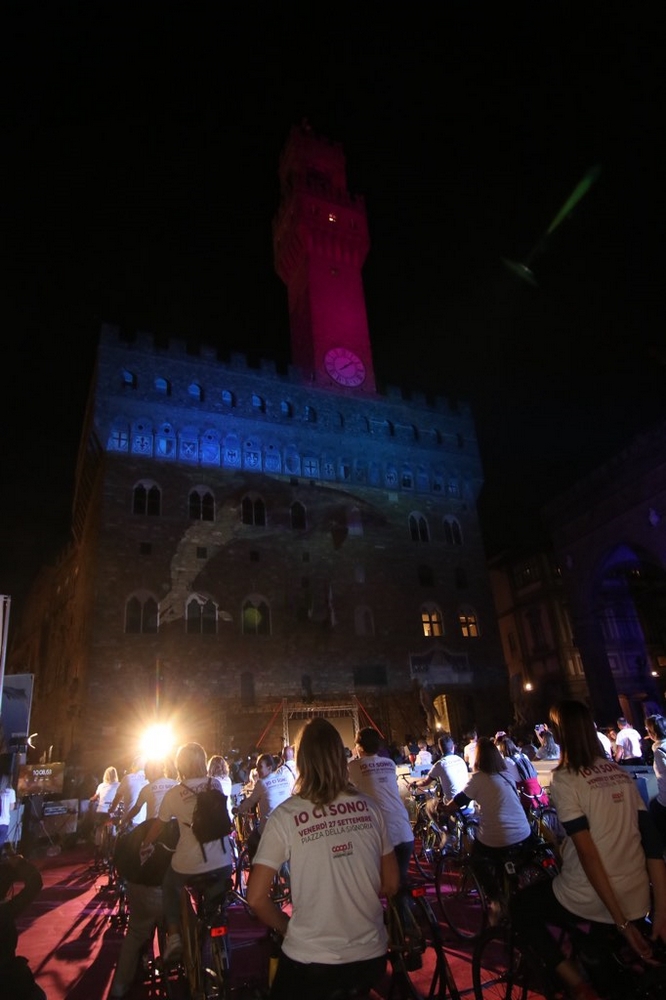 Grande partecipazione per l’iniziativa di Unicoop Firenze Sali in sella e illumina Palazzo Vecchio: i posti disponibili per la registrazione (800) erano già esauriti da questa mattina e in piazza si sono presentate oltre mille persone, per pedalare per l’ambiente e produrre energia pulita per la proiezione di immagini ambientali sulla facciata di Palazzo Vecchio.